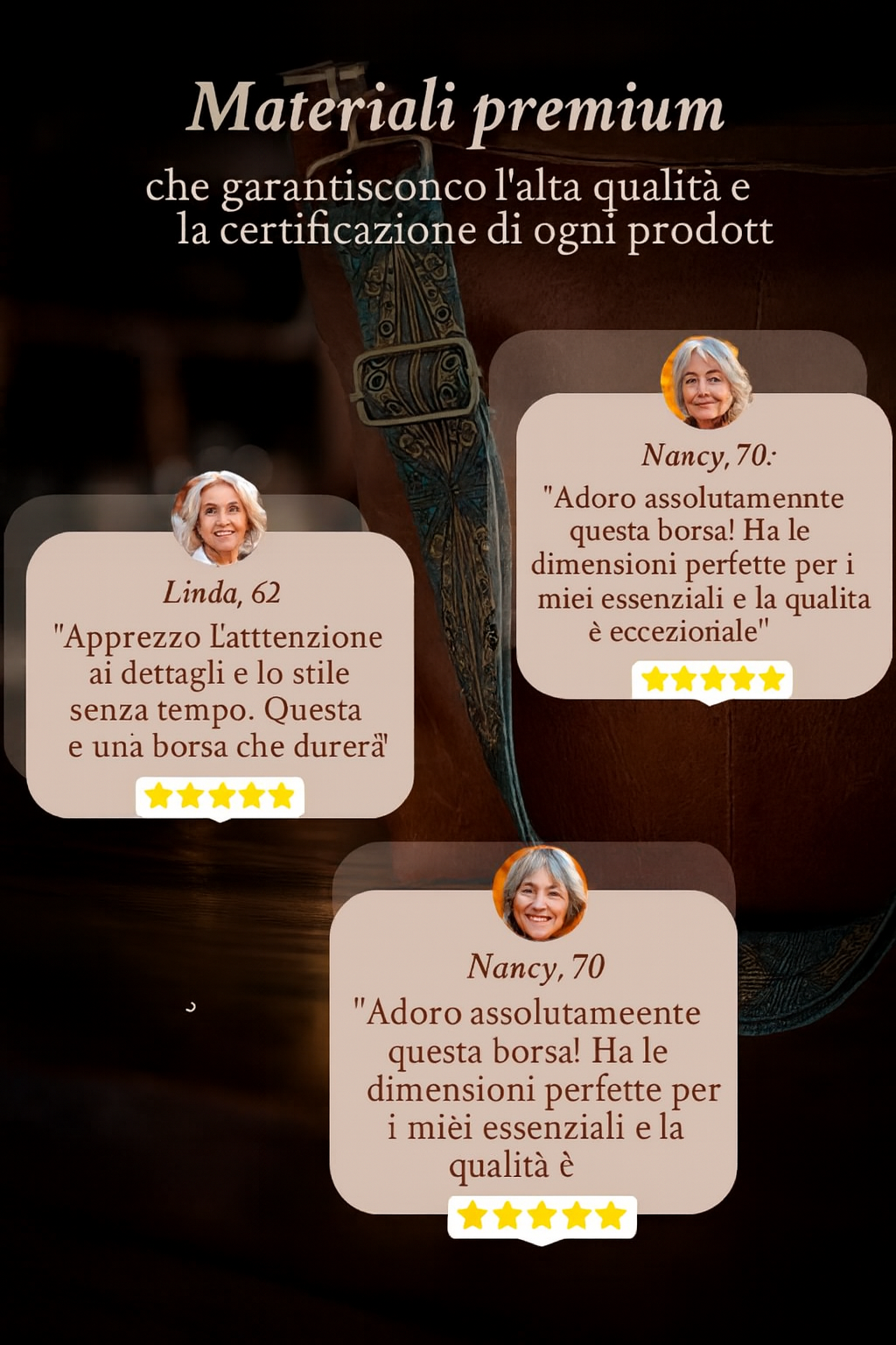 «Sono assolutamente innamorata della mia nuova borsa in pelle! La lavorazione artigianale è incredibile e si vede che ogni dettaglio è stato curato con attenzione. È il perfetto equilibrio tra stile e durata!»